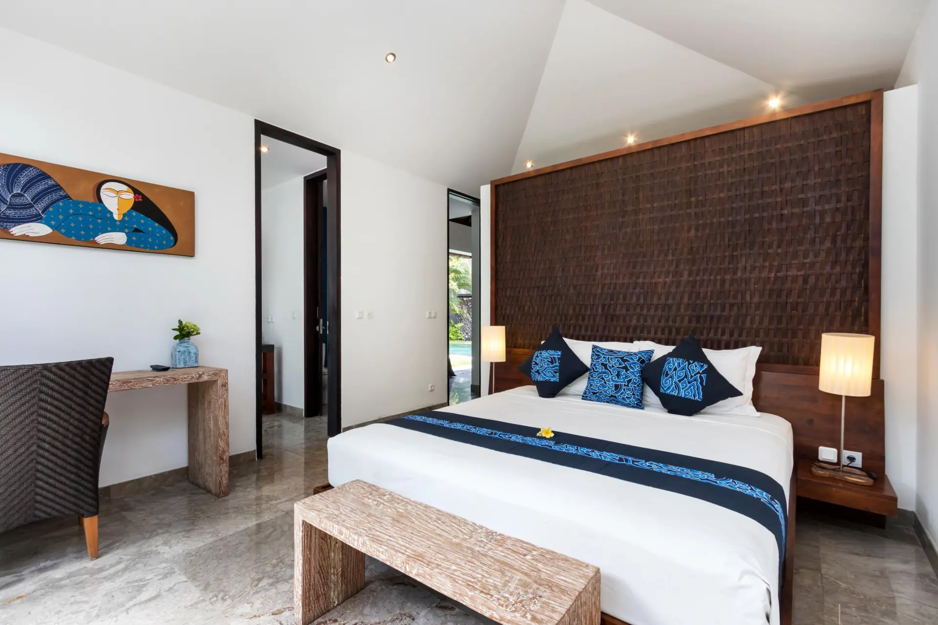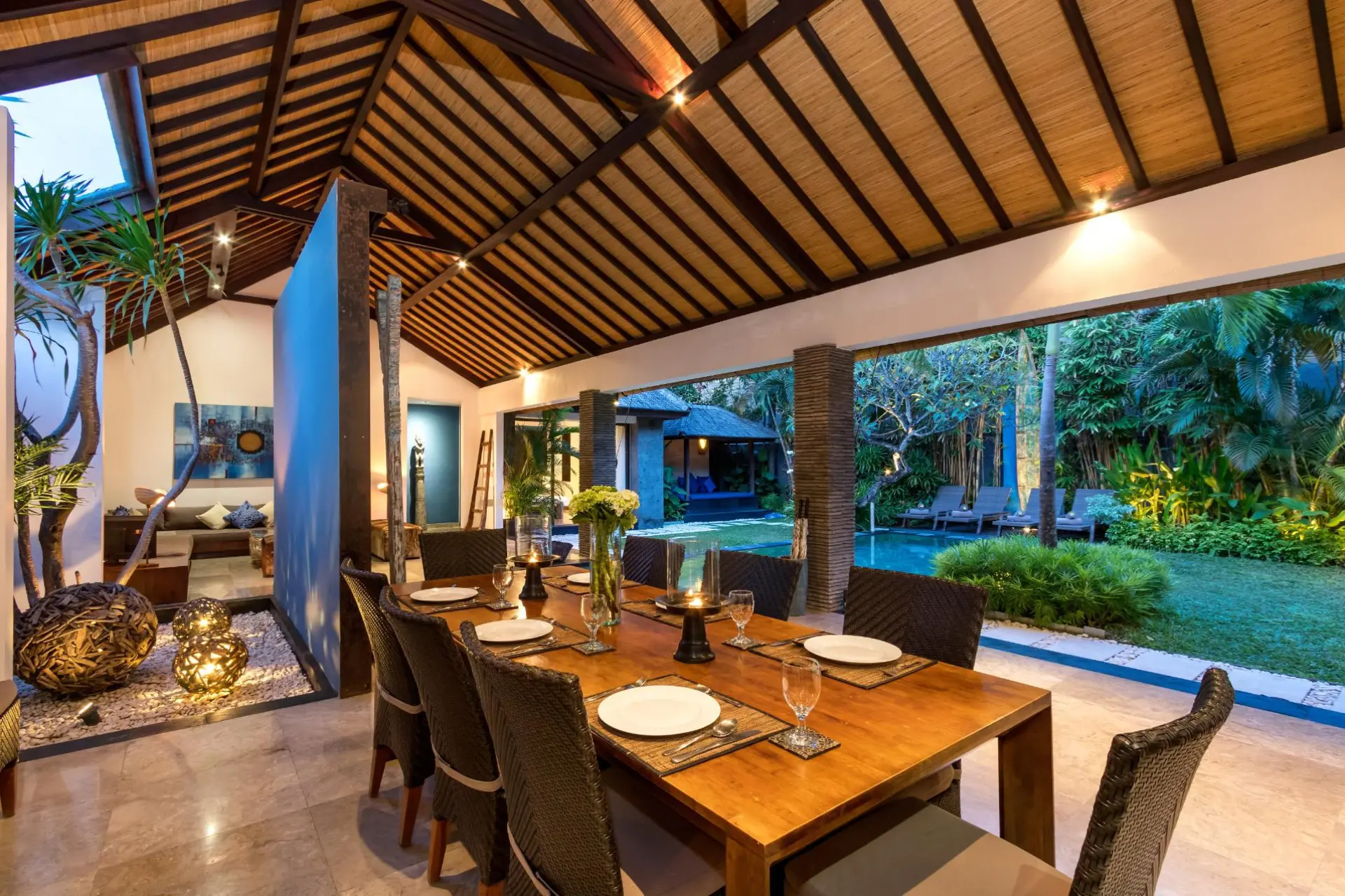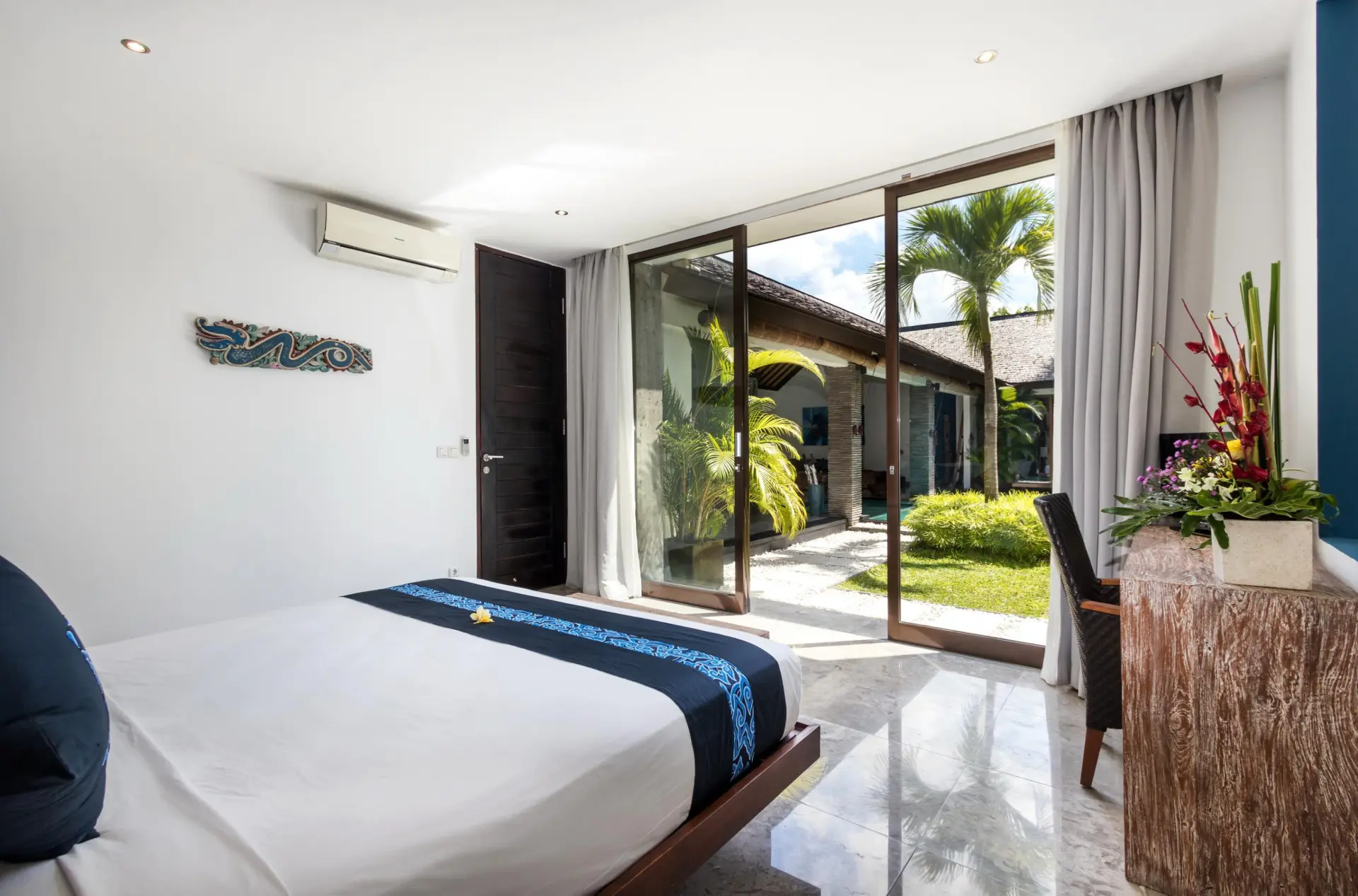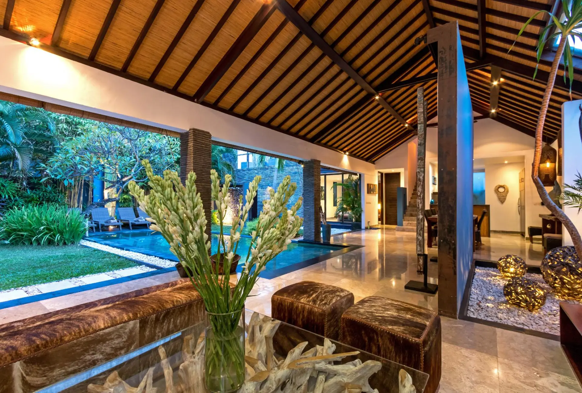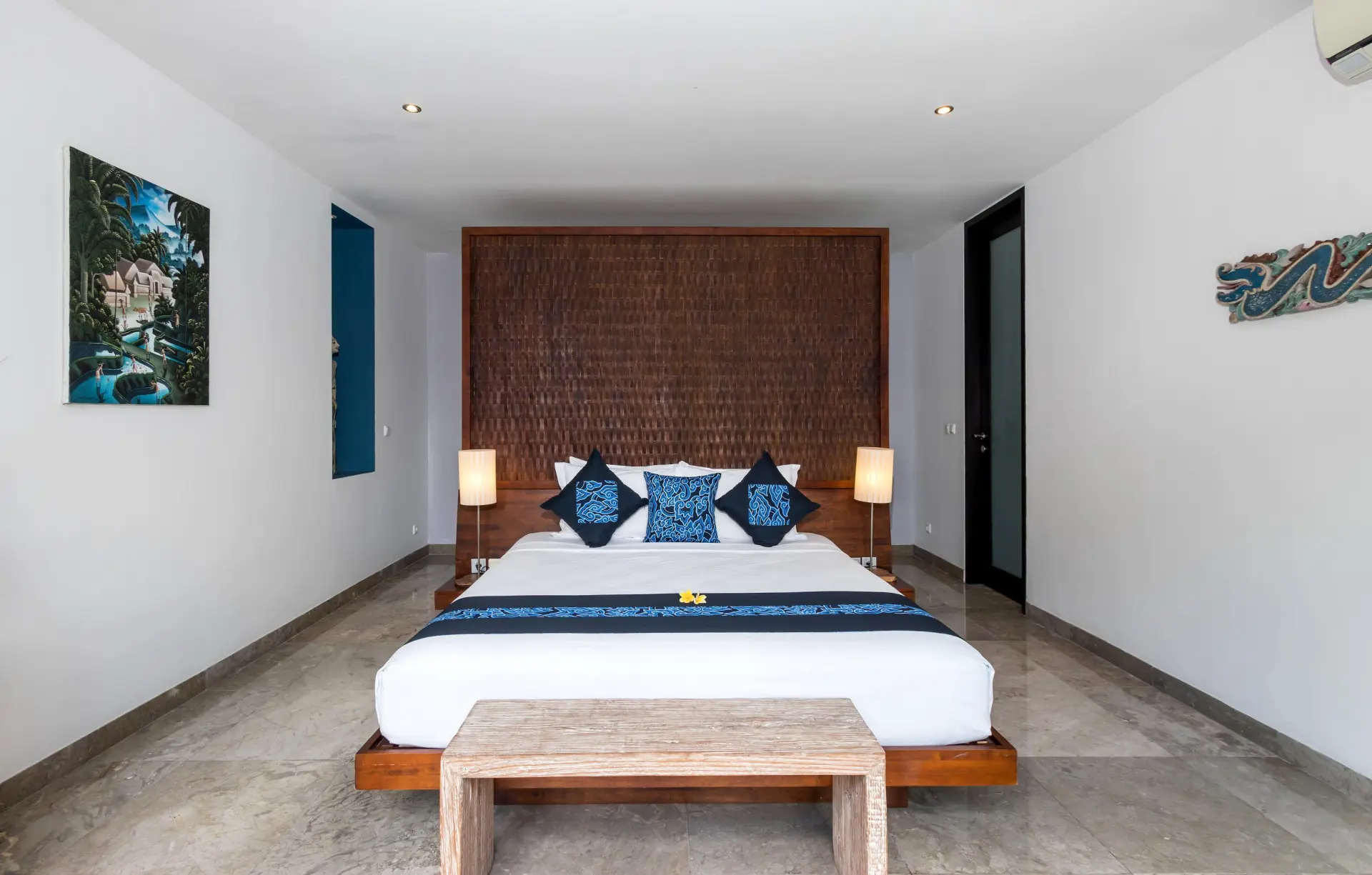 About Villa Anjali Blue Designed in a linear, ‘Long House’ structure, Villa Anjali Blue in Seminyak is a four-bedroom traditional Balinese home which is part of the private estate Anjali Villas – home to four individual villas. With its distinct blue shade found around the villa, the villa features traditional architecture with alang-alang ceiling that slants and keeps the rooms cool and comfortable. Celebrating openplan living, the spacious layout of the living and dining space is at once refreshing and calming for the senses! The location is unbeatable as it is situated in the bustling district of Petitenget, close to the beach, restaurants, bars, etc. Outdoor and Pool area Sitting perpendicular to the living and dining pavilion at Villa Anjali Blue is the 9-metre swimming pool which is bordered by wellmanicured gardens on both sides. The pool’s edge that lies indoors is flanked by a Balinese stone wall to add a dramatic effect to an otherwise simplistic space. With towering palm trees and verdant foliage, the gardens are a wholesome and refreshing corner of the villa for relaxation, rejuvenation, and sunbathing. The sun chairs found on the garden beside the pool are ideal for stretching and working on a tan! Take a nap on the daybed found in the bale to wake up energized and ready for the evening. Living Areas Featuring a comfortable corner furnished with ottoman, an L-shaped sofa, and artwork signifying the blue of the villa, the living area is open-sided with unobstructed views of the garden and pool. Whether it is early morning or late evening, you can bask in the precious turns that nature takes throughout the day! Kick back and relax on the comfortable sofa while sipping on some tea with friends and family or watch TV on the flat-screen. Although guests are free to eat wherever they wish, Villa Anjali Blue does house a proper dining area with a dining table that accommodates eight guests to make it even more comfortable and enjoyable. In the far corner of this linear arrangement is the kitchen which is western and provides ample modern amenities. Bedrooms There are four, air-conditioned bedrooms at Villa Anjali Blue, each of them equipped with a backlight, a shade of blue significant to its name. Three bedrooms are found downstairs – two with pool access and one that leads to a private garden – and one is found upstairs adjoined to a furnished terrace that provides spectacular views. There is enough privacy in each of these bedrooms to ensure guests have everything they wish. The bedrooms are furnished with king-sized beds, TVs, and work desks. En-suite bathrooms are indoors with outdoor showers for an authentic tropical feel. Staff & Services A fully-staffed villa, there is everything that you need so you can actually enjoy a holiday and not get tied down with simple chores and responsibilities. Housekeeping, pool/garden maintenance, security, etc. are the staff’s responsibility. For an additional cost, you can avail personal guest assistance for individual needs. Rent out cars, bikes, or scooters to explore town the right way and get a massage in-house for the best spa therapies! These services are charged extra.