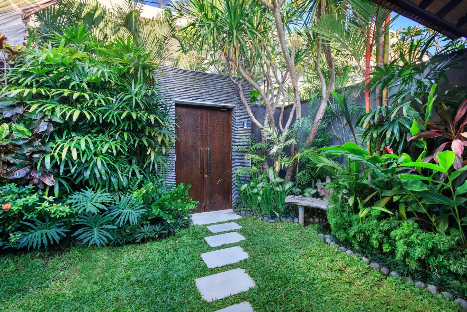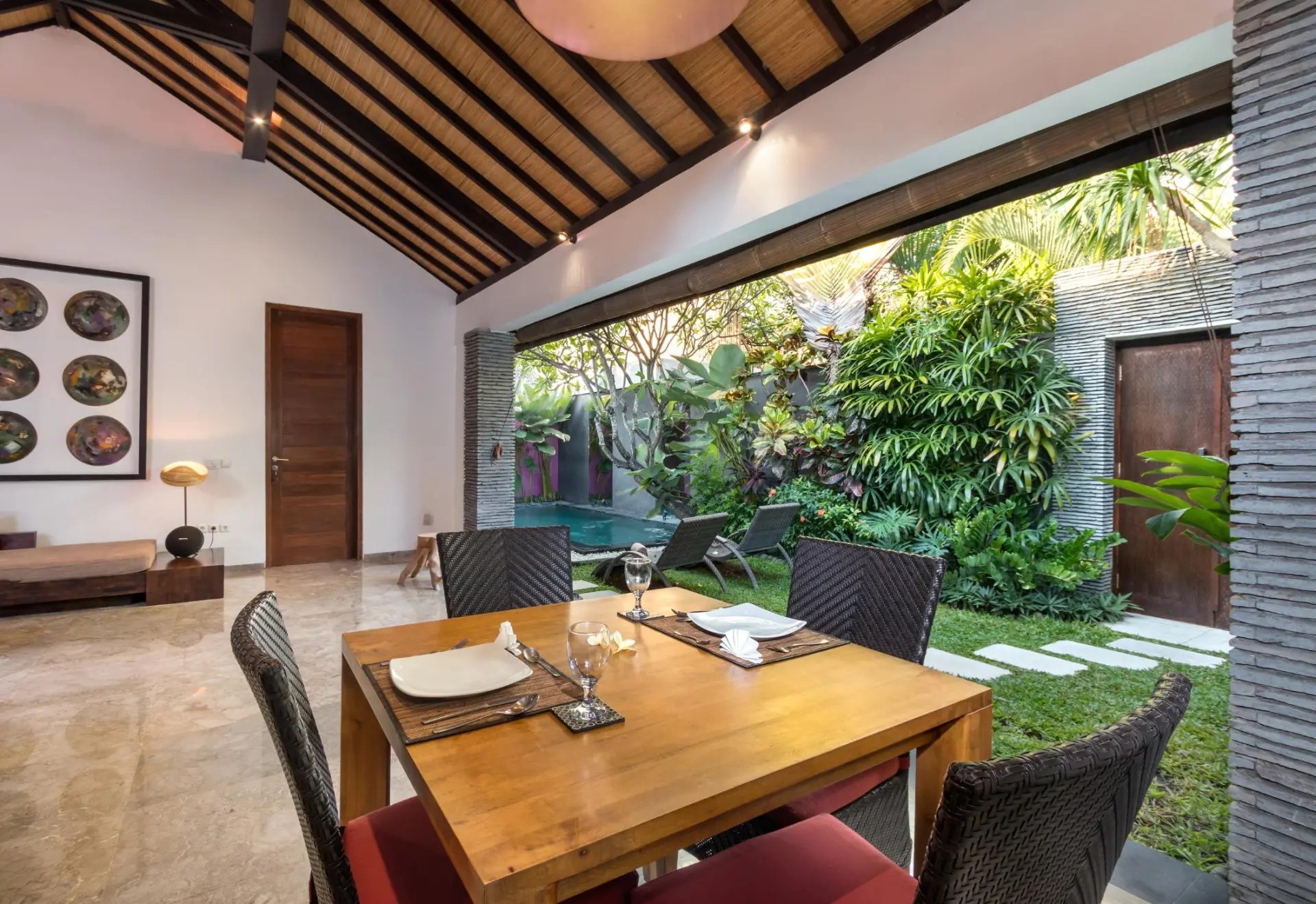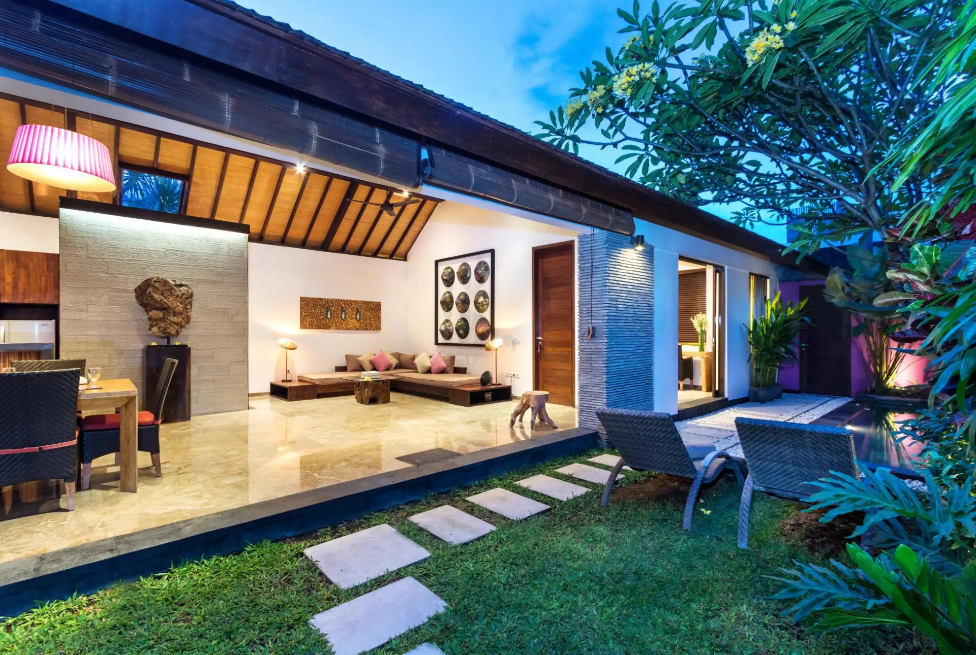 About Anjali Purple A charming, one-bedroom villa in the heart of Seminyak’s Petitenget district, Villa Anjali Purple has been designed with a traditional Balinese home in mind featuring alang-alang ceiling, Asian décor sourced by French designers, and natural elements to make it a tropical home. With a private swimming pool out front, the villa has accents of purple on walls, furniture, and other décor. A beautiful space meant for couples on their honeymoon, the villa is a private sanctuary away from prying eyes to give you a sense of security. Outdoor and Pool area You have an entire 8-metre swimming pool all to yourself which is flanked by a stone wall with full-length mirrors that reflect the entire area including the verdant gardens. Tropical plants and trees mark the periphery of the pool and there is a pebbled pathway that leads to and from the open-plan living area. When you want to relax and take a break from swimming, head to the sun chairs that are found on the deck where you can stretch, lather on some sunscreen, and get working on a golden tan! Living Areas Located alongside the length of the swimming pool, the living area at Villa Anjali Purple is completely open-plan for a more spacious, breezy, and airy ambiance. With sunlight streaming indoors in abundance, the living room is definitely an ideal corner for couples where they can spend time without any interruptions, enjoying the peace and quiet of this home away from home. It has been furnished with plush sofas and chairs, antique and hand-crafted décor, as well as soothing colours to keep it simple and light. The ceiling hints at the Balinese roots of this house with an alang-alang slanted structure! In order for you to dine with aplomb and comfort, there is afour-seater dining table in the living room, found right at the entrance from the pool so you have a splendid scenic view throughout. Cook for two in the fully-equipped kitchen or invite a personal chef to prepare meals bursting with flavour! Bedrooms Adjacent to the living and having its private entrance from the garden area, the master bedroom at Villa Anjali Purple is a beautifullydesigned space with a king-sized bed. Draped with ikat-print linen, the room is inviting and warm, so you can rest easy making yourself at home. The dominating colour here is purple blended with pristine white which works well with the natural green spotted from the glass doors! The comfortable bedroom is air-conditioned, fitted with a TV, and a safety deposit for your valuables. There is a writing desk for guests in case you wish to call on the author inside or to get last minute work done! An en-suite bathroom accompanies the bedroom which features an outdoor shower. Staff & Services The staff at Villa Anjali Purple is friendly and generous towards the guests extending their hospitality to the max. There are plenty of services on offer including housekeeping, garden/pool maintenance, security so you have no need to worry about a thing. If you wish, you can even request for massages, transportation, etc. for extra charge.
