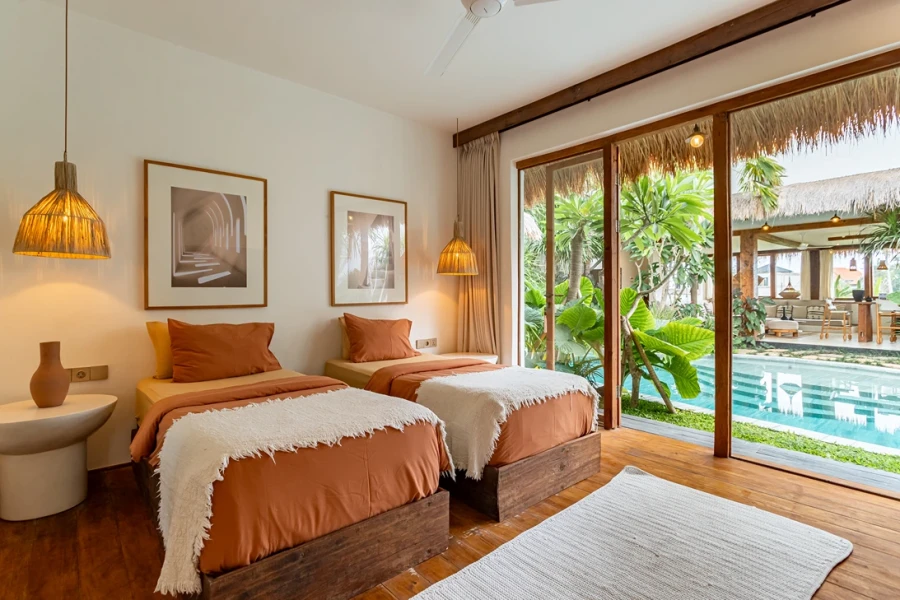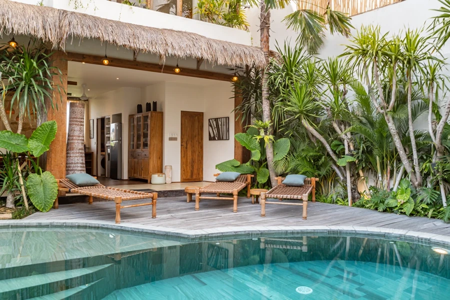 About the Villa Welcome to Villa Belle Oasis, your very own slice of paradise nestled amid the enchanting rice fields of Canggu-Umalas! This beautiful two-story villa, topped with a traditional thatched roof, is the perfect getaway for friends and family looking to unwind and create unforgettable memories. With space for up to 14 guests, it’s designed for relaxation and fun, making it an ideal choice for your next Bali adventure. Outdoor Areas The outdoor spaces feature a stunning swimming pool surrounded by a vibrant tropical garden, sun loungers, and a cozy gazebo for lounging. You can dive into the refreshing pool, unwind with a book while enjoying the serene surroundings, or indulge in a floating breakfast to elevate your stay! Indoor Areas Inside, the villa boasts a spacious living room that offers breathtaking views of the rice fields. This elegantly designed area includes comfortable seating, a dining table, and a well-equipped kitchen with modern amenities. Additional facilities, such as a guest toilet and laundry room, ensure convenience during your stay. Bedrooms Villa Belle Oasis features five stylishly designed bedrooms, each serving as a serene retreat. The two bedrooms on the first floor provide direct access to the pool, with one offering twin beds and the other a queen-size bed and TV. Upstairs, the three bedrooms include two that offer stunning views of the rice fields, with one being a queen-size room with a relaxing bathtub, and the other a luxurious master suite featuring a queen-size bed and soaking tub. The accommodations can host up to 14 guests, with options for extra beds available. Our Services To make your stay even more enjoyable, Villa Belle Oasis offers daily housekeeping and a range of additional services like in-villa massages, private drivers, and scooter rentals. For families, we provide essential baby equipment like cots and high chairs, along with safety features like pool gates. Contact our welcome team who will cater your needs during your stay! Plus, with Batu Belig Beach just a short stroll away and central Canggu only a 15-minute scooter ride, you’ll be perfectly situated to explore all that Bali has to offer! Come and experience the magic of Villa Belle Oasis—your Bali dream awaits!