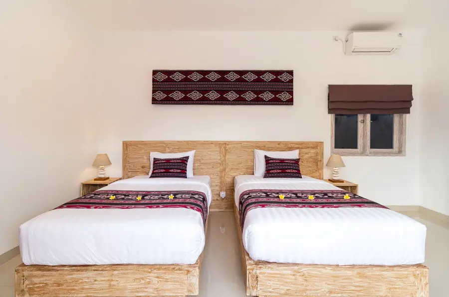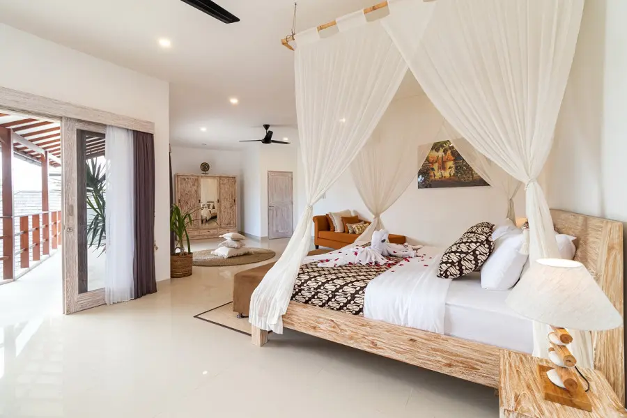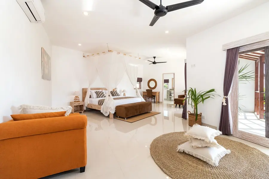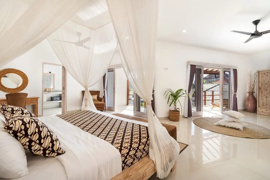 About Villa Hiburan 1 Located just a 10 minute walk from Batubelig Beach, Villa Hiburan 1 is the perfect base for families and groups of friends. Featuring one of the largest master bedrooms in Seminyak (you get your own floor!), a jacuzzi, and an interconnecting room for families, it really is your ticket to paradise. Villa Hiburan 1 is a four-bedroom villa that is ideally suited for families, groups of friends or couples. It is located at the end of a private lane in Seminyak, only 5 minutes from it’s trendy Petitenget neighborhood. It’s strategic location also puts you only 10 minutes away from Cafe Del Mar beach club! Outdoor and Pool Area The walled gardens, lush gardens and a poolside bale with a thatched roof all add to the charm of the laid-back Balinese home away from home. Relax on natural rattan sunbeds while your children play in the wading pool. No children around? Take advantage of your private jacuzzi! Living Area To enjoy the outdoors to the fullest, Villa Hiburan 1 has an open-concept, open-plan living and dining area. The interiors are at once modern and sophisticated where the natural outdoors works as the décor. The pristine walls of the living area, framed mirrors reflecting the green gardens and landscape art create a welcoming and soothing ambiance. The L-shaped sofa occupies the corner overlooking the garden. A flat-screen TV is mounted on the wall, so you can lie back and relax. The kitchen is modern with top of the line appliances, a chic breakfast bar with a granite top, high stools for additional seating, and other useful amenities. You can relish your food on the eight-seater dining table that stands against the entrance to the living space so you have sumptuous garden views to go with a delicious feast. Bedrooms Villa Hiburan 1 boasts four, well-furnished and air-conditioned bedrooms of which the master suite is found upstairs and the remaining three are found poolside with glass doors that lead you directly to the pool. The master bedroom is the most spacious with its own lounge area, private balcony and a king-sized bed with a stunning canopy. The pleasing colours, calming décor such as indoor plants, distressed furniture and jute rugs make the bedrooms a true haven for guests. The ensuite bathroom is equally luxurious with a tropical shower under a pergola roof and plants along the walls. The three guest bedrooms are furnished with queen beds and one with single beds. They are decorated with beautiful artwork, straw hats, jute baskets, batik prints and washed-out furniture for a rustic feel. Each bedroom comes with an ensuite bathroom. Two of the bedrooms are interconnecting; perfect for parents who would like to keep an eye on their children! Staff and Services Services at Villa Hiburan 1 include daily housekeeping, pool/ garden maintenance and upkeep of the property. The staff is welcoming and attentive to the needs of guests and they pay special attention to any requests you may have. If you need babysitters, child-safety amenities, or wish to rent a car with driver, bicycles and scooters, the staff can arrange the same for an extra cost. Other special services include massages, a private chef and a BBQ.