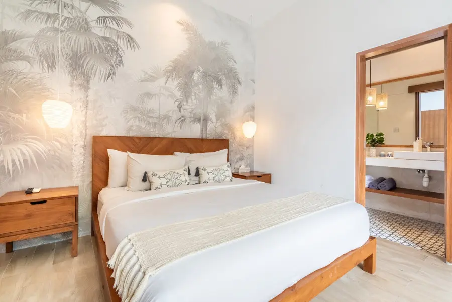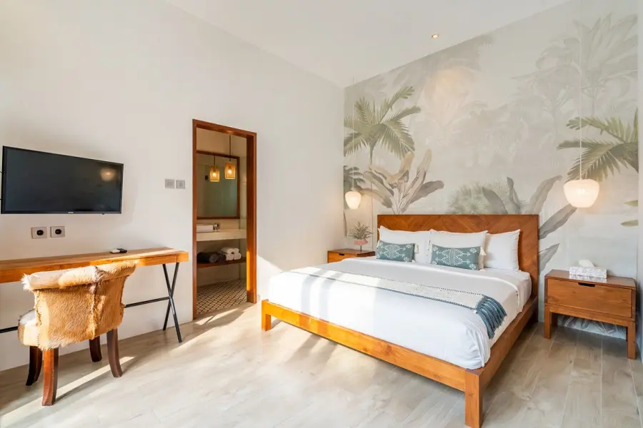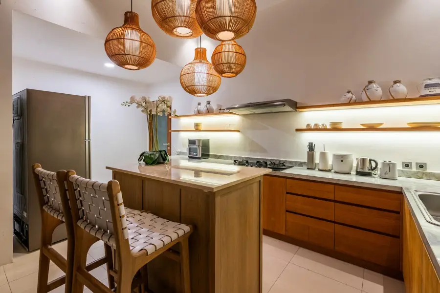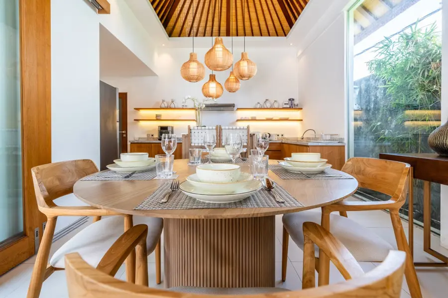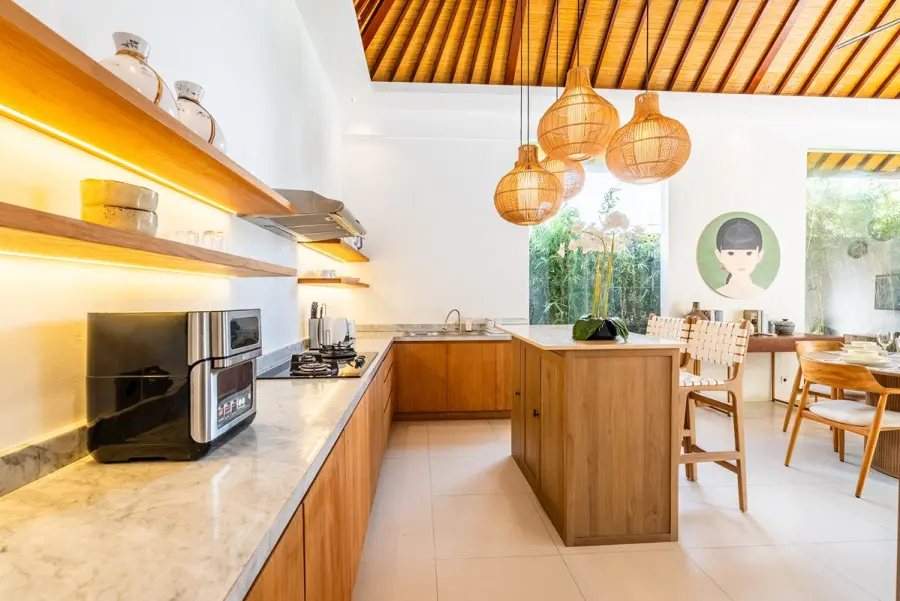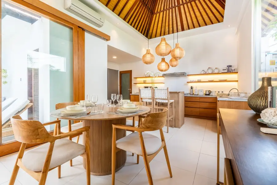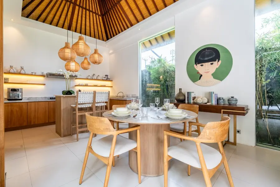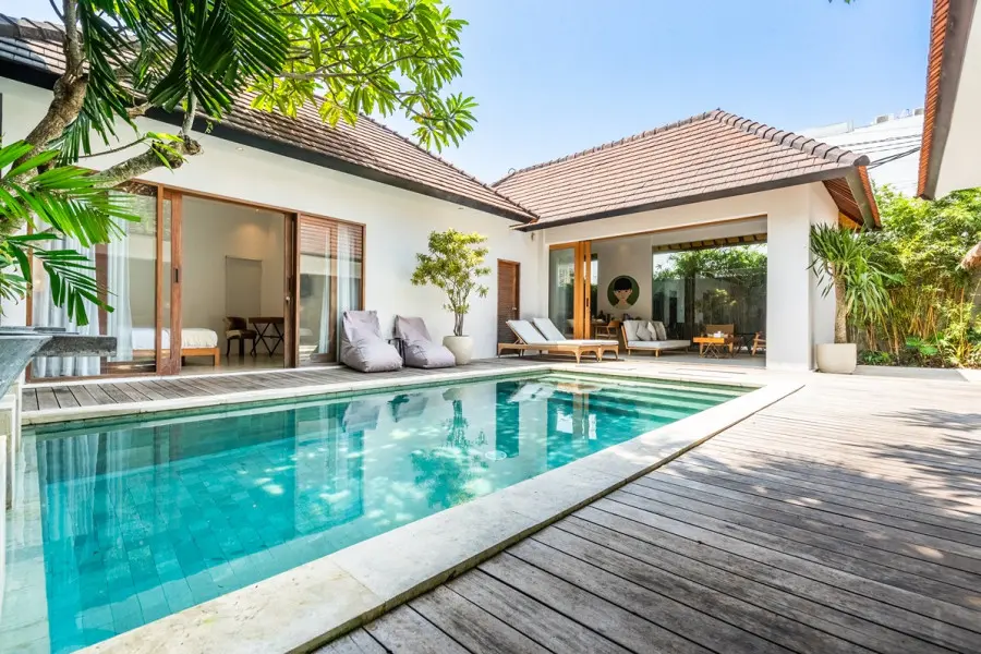 About Villa Lapis Villa Lapis 1 is a boho-chic 3 bedroom villa located in the heart of Canggu’s popular area, Berawa. Boasting a private swimming pool, 3 spacious bedrooms and open air living areas it is the perfect place for a relaxing tropical holiday with your family and friends. A short walk from Villa Lapis are some of the area’s most popular restaurants including Milk and Madu. In a 3 minute drive you will be at the beach with Finn’s Beach Club offering a luxurious beach day setting. The Outdoor Areas The private swimming pool in Villa Lapis 1 sits at the centre of the villa luring you in for a cooling swim. Surrounded by a wooden decking with lounging bean bags, you can lay out in the Bali sun comfortably. Filled with tropical greenery and a water feature, the garden of Villa Lapis 1 is a relaxing retreat from the hustle and bustle. You can sit back and bask in the peaceful space whilst enjoying time with your family and friends. The Indoor Areas The living areas within Villa Lapis 1 have an open air concept allowing a fresh breeze to flow through the space. A comfortable living room, dining table and fully equipped kitchen occupy the room with a large glass wall offering a glimpse out to tropical greenery. Overlooking the pool, the living area is the perfect place for parents to supervise their children playing in the water. With a plush couch, flat screen TV and boho accessories, it is a relaxing place to enjoy a quiet afternoon reading or watching TV. The fully equipped kitchen is prepared should you wish to cook your own homemade meals to be served at the comfortable dining table. Devour delicious home cooked food or restaurant delivered meals in the privacy of your own dining room. The Bedrooms Each of the bedrooms in Villa Lapis 1 offer a tranquil retreat from the hustle and bustle of the town. Brightly decorated with simplistic artworks and clean furnishings, you will be lured in for a restful night’s sleep in the comfortable bedding cooled by the room’s air conditioning. Featuring large wardrobes, a writing desk and TV you have everything you need for a homey relaxing stay. Rolling patio doors offer direct access and views out to the wooden decking and pool allowing natural light to flood the bedroom throughout the day. All of the bedrooms have their own en-suite bathrooms fitted with modern facilities and rain showers. Staff and Services Cared for by a team of dedicated staff, Villa Lapis 1 offers daily housekeeping to ensure you are comfortable and relaxed throughout your stay. With CCTV and nightly security, you do not need to worry about the safety of the villa. On hand from the moment of your arrival until you check out, the staff are keen to help with any additional services or queries you may have. Offering local recommendations for the best restaurants and must see tourist spots, you will have a memorable trip thanks to the uncompromised service.