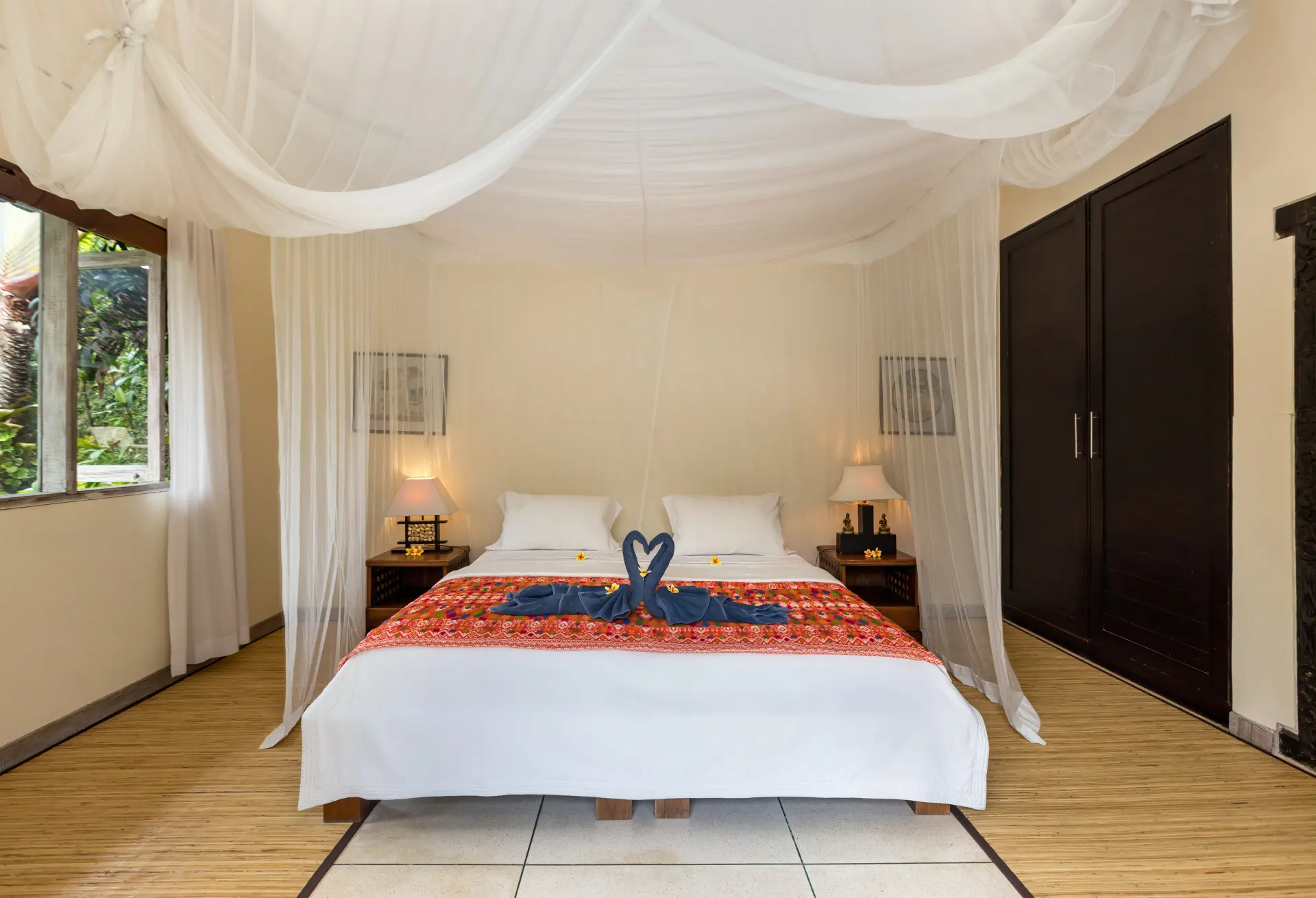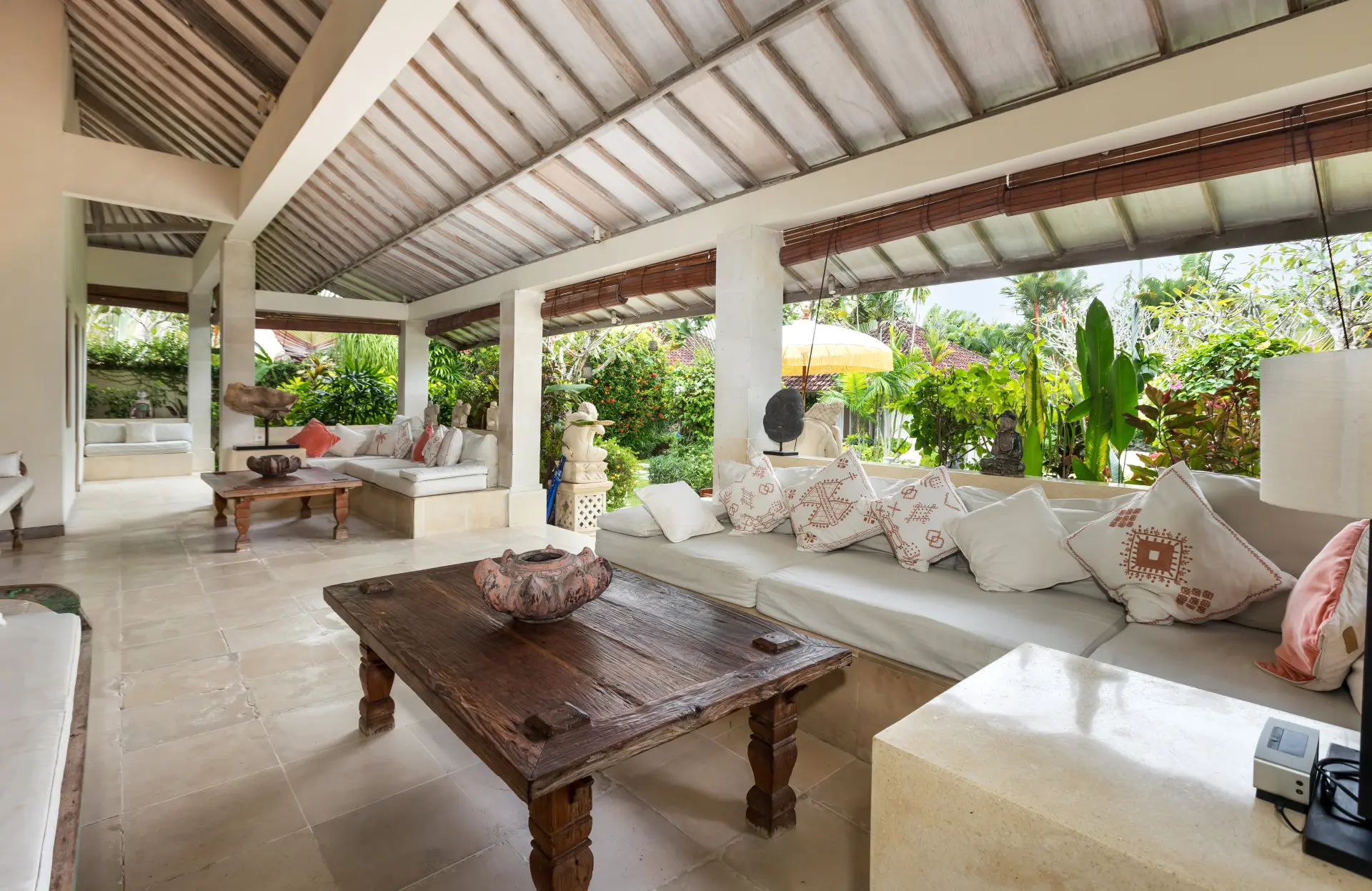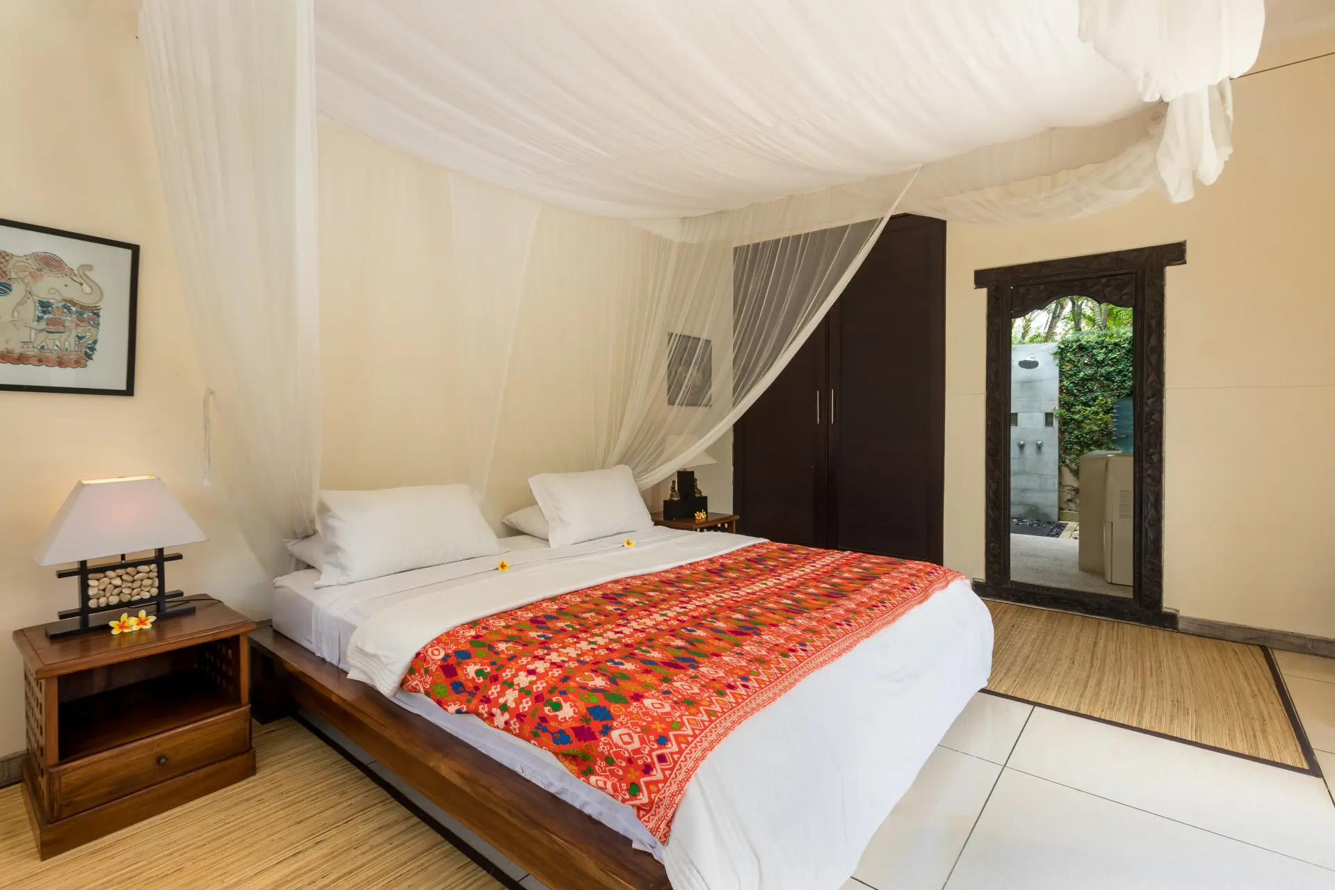 About Villa Sembira Villa Sembira is an amazing 6 bedroom holiday haven with not just 1 or 2 but 3(!) swimming pools and multiple hangout areas, both indoors and out, perfect for large families or a big group of friends wanting to stay somewhere quiet yet strategic towards the buzzing town of Seminyak, the beach and the hot spots of Canggu. Villa Sembira is the combination of the 4-bedroom Villa Senang and the 2-bedroom Villa Gembira. Together, they make one wonderful retreat to spend your holiday in Bali with loved ones. The Bedrooms Villa Sembira houses a total of 6 bedrooms, 2 tucked away privately at Villa Gembira, 2 in the main house of Villa Senang and 2 in stand alone bungalows the lower level of the garden of Villa Senang, giving privacy to everyone. Each and every bedroom is perfectly restful and comfortable, decorated tastefully with traditional artwork, fitted with a large canopied king-size bed of which 2 can be split into twin beds and every room has their own satellite television with DVD-player to watch a movie or two before sleep, in the comfort of your own bedroom. The rooms have generous-size wardrobe closets and private en-suite bathrooms designed open-air for the full-blown tropical open-air showering and/or bathing experience. Guaranteed you will love it! The living area The wonderful thing about having 2 villas merged into one grand holiday estate, is that you will have lots of places to hang out as well as quiet corners to curl up with a book. You even have 2 kitchens for your usage, so one can prepare cocktails in one of the kitchens while the other is preparing snacks in the other one. There are comfy sofas to relax on and dining areas to enjoy breakfast all together before plunging in the pool in the morning. All the comforts needed in your home away from home in Bali and much more! Outdoor and pool area A definite highlight of Villa Sembira is that there are 3 swimming pools to plunge into, divided over two peaceful lush green gardens. In one of these sprawling gardens, the main 12-meter swimming pool gently overflows into a smaller pool in the lower level of the garden. How idyllic is that? The third swimming pool is tucked away privately at the back of Villa Gembira, the perfect place to enjoy some tranquility by the waterside. Both gardens feature reclining chairs and Balinese parasols as well as shady balés with tropical thatched rooftops to take a daytime snooze as the kids splash around in the swimming pools. Just wonderful! Staff and services Villa Sembira is staffed with a heartwarming team of staff. There is personal guest assistance where needed, housekeeping and security service. A private car and driver, in-villa massages and restaurant reservations can all be arranged for you upon request. Don’t hesitate to ask all of your questions.
