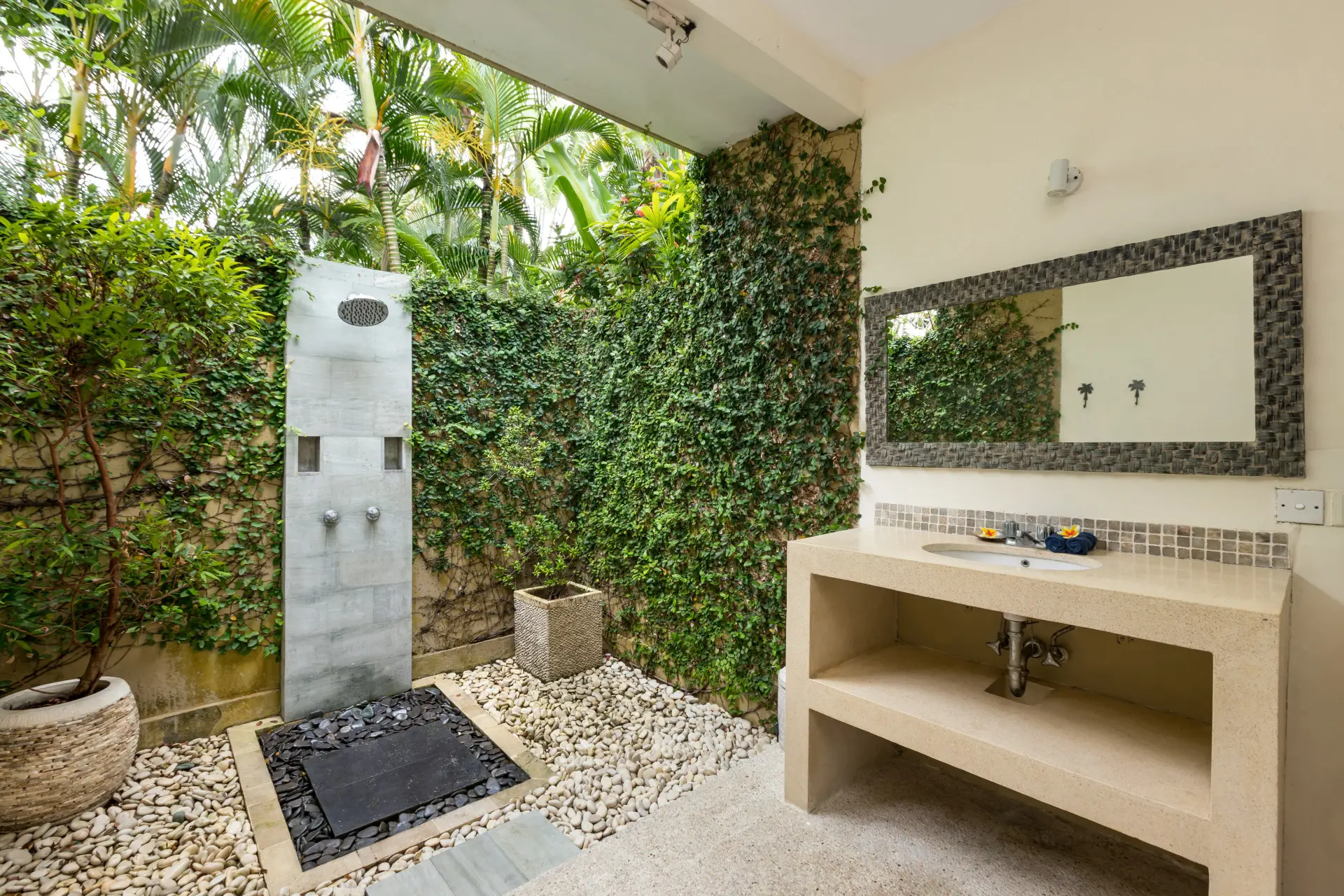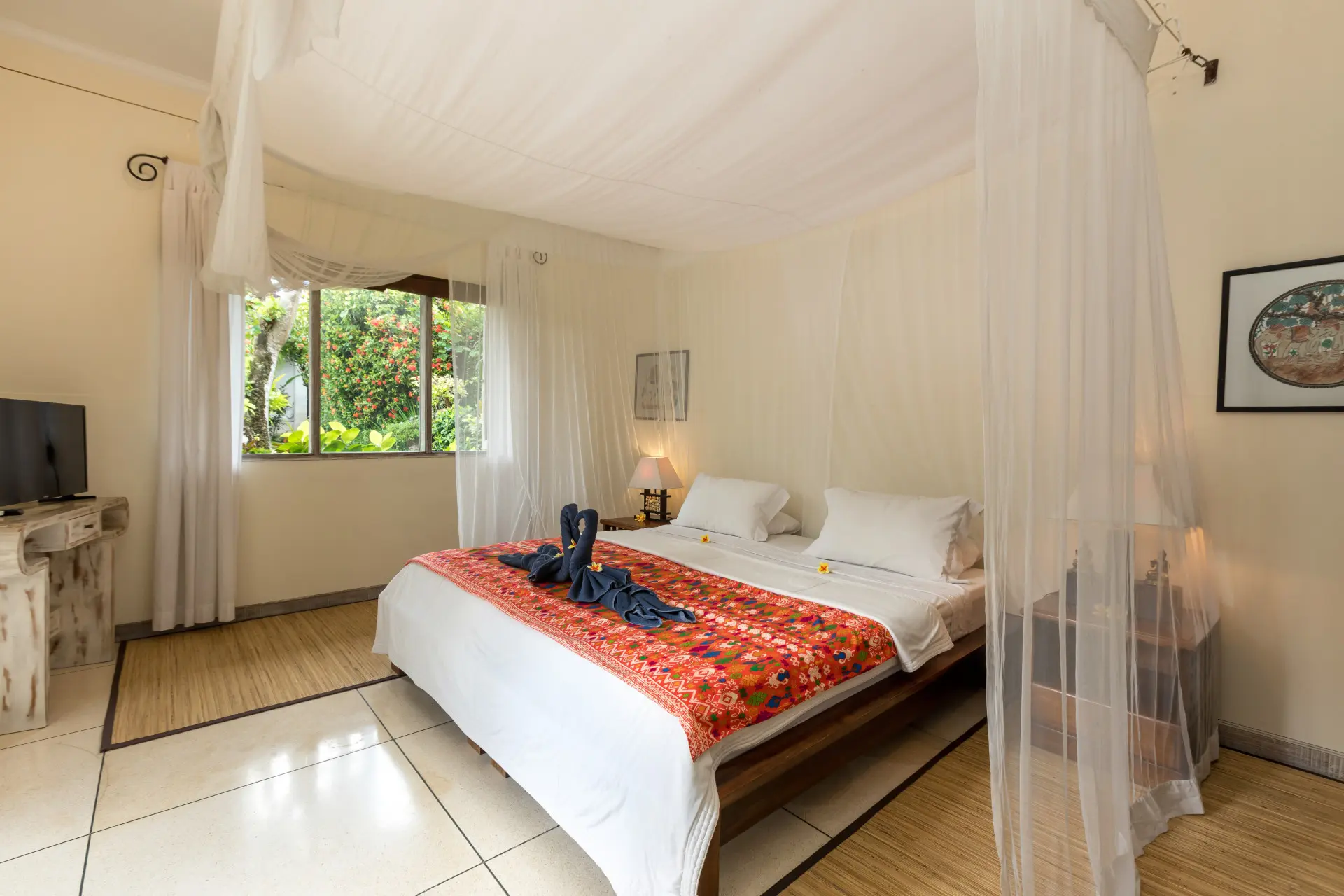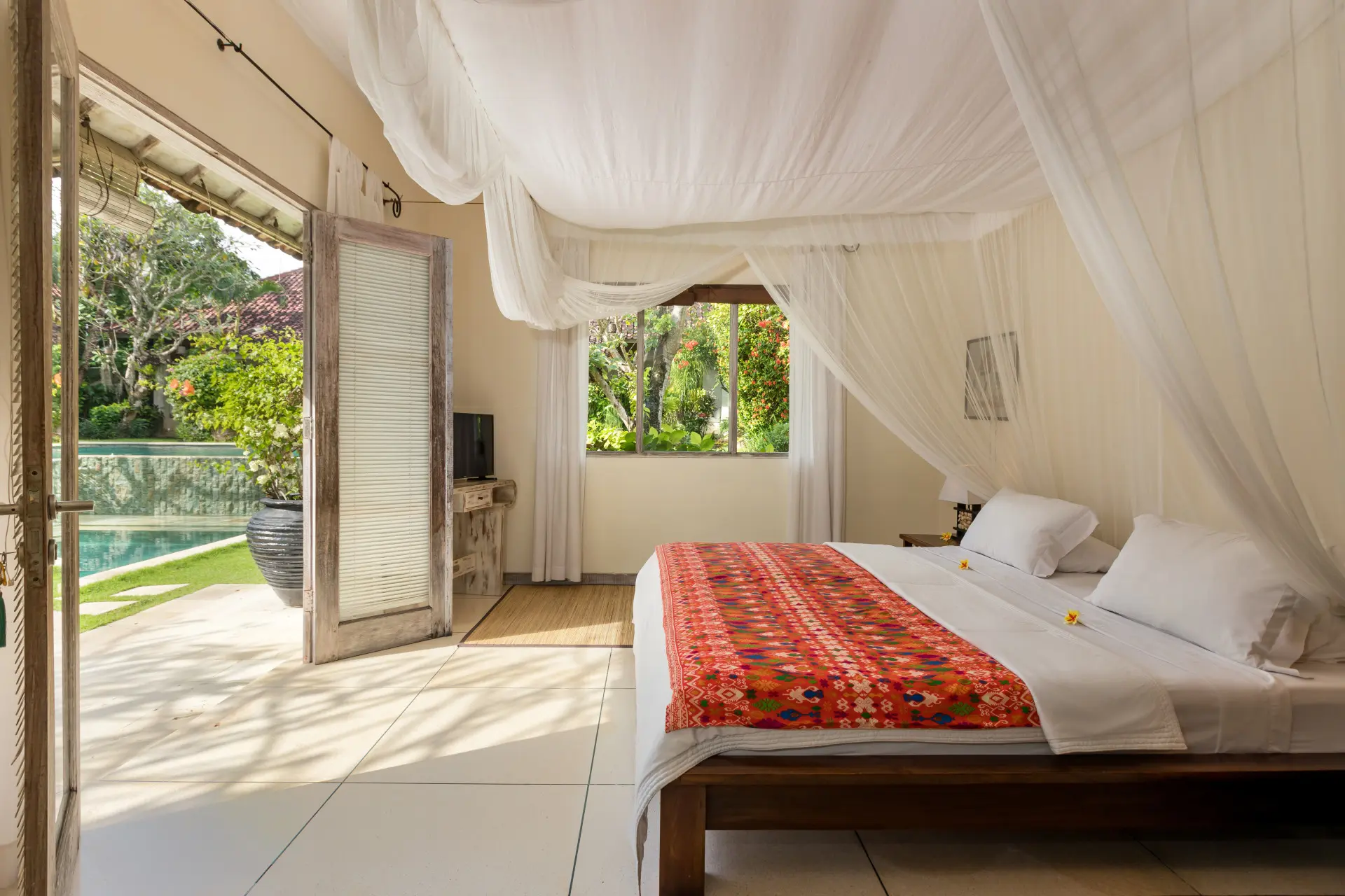 About Villa Sembira Villa Sembira is an amazing 6 bedroom holiday haven with not just 1 or 2 but 3(!) swimming pools and multiple hangout areas, both indoors and out, perfect for large families or a big group of friends wanting to stay somewhere quiet yet strategic towards the buzzing town of Seminyak, the beach and the hot spots of Canggu. Villa Sembira is the combination of the 4-bedroom Villa Senang and the 2-bedroom Villa Gembira. Together, they make one wonderful retreat to spend your holiday in Bali with loved ones. The Bedrooms Villa Sembira houses a total of 6 bedrooms, 2 tucked away privately at Villa Gembira, 2 in the main house of Villa Senang and 2 in stand alone bungalows the lower level of the garden of Villa Senang, giving privacy to everyone. Each and every bedroom is perfectly restful and comfortable, decorated tastefully with traditional artwork, fitted with a large canopied king-size bed of which 2 can be split into twin beds and every room has their own satellite television with DVD-player to watch a movie or two before sleep, in the comfort of your own bedroom. The rooms have generous-size wardrobe closets and private en-suite bathrooms designed open-air for the full-blown tropical open-air showering and/or bathing experience. Guaranteed you will love it! The living area The wonderful thing about having 2 villas merged into one grand holiday estate, is that you will have lots of places to hang out as well as quiet corners to curl up with a book. You even have 2 kitchens for your usage, so one can prepare cocktails in one of the kitchens while the other is preparing snacks in the other one. There are comfy sofas to relax on and dining areas to enjoy breakfast all together before plunging in the pool in the morning. All the comforts needed in your home away from home in Bali and much more! Outdoor and pool area A definite highlight of Villa Sembira is that there are 3 swimming pools to plunge into, divided over two peaceful lush green gardens. In one of these sprawling gardens, the main 12-meter swimming pool gently overflows into a smaller pool in the lower level of the garden. How idyllic is that? The third swimming pool is tucked away privately at the back of Villa Gembira, the perfect place to enjoy some tranquility by the waterside. Both gardens feature reclining chairs and Balinese parasols as well as shady balés with tropical thatched rooftops to take a daytime snooze as the kids splash around in the swimming pools. Just wonderful! Staff and services Villa Sembira is staffed with a heartwarming team of staff. There is personal guest assistance where needed, housekeeping and security service. A private car and driver, in-villa massages and restaurant reservations can all be arranged for you upon request. Don’t hesitate to ask all of your questions.