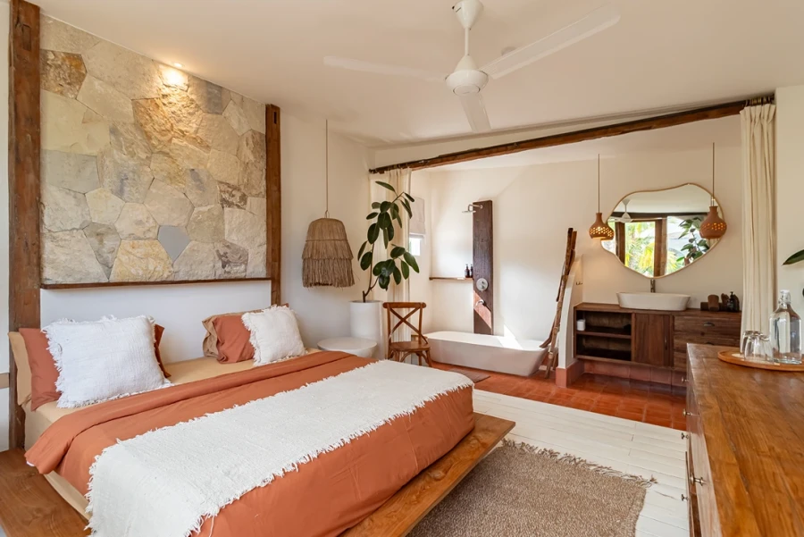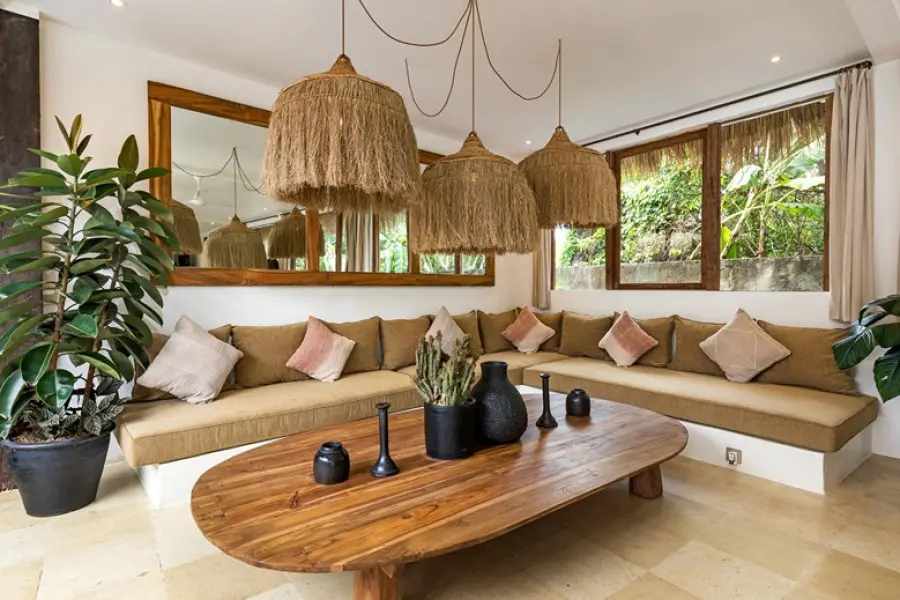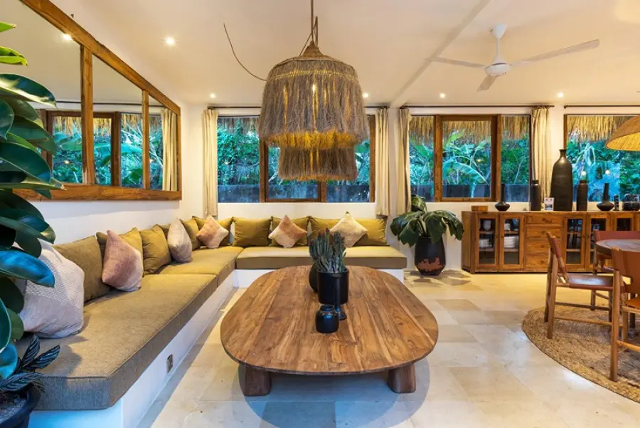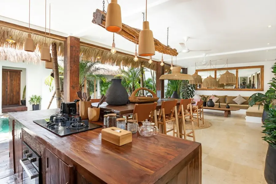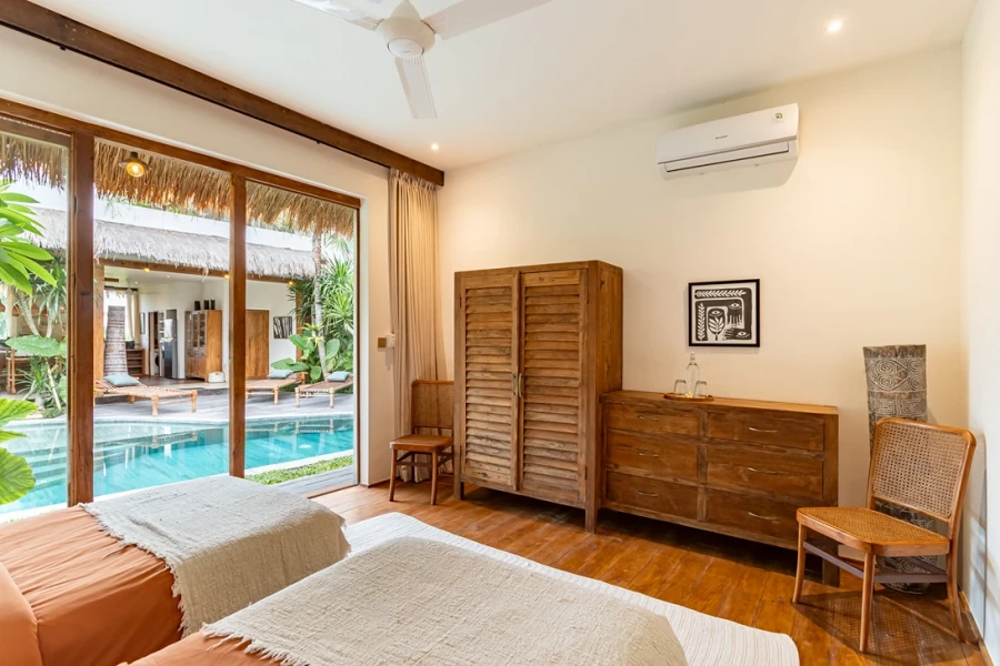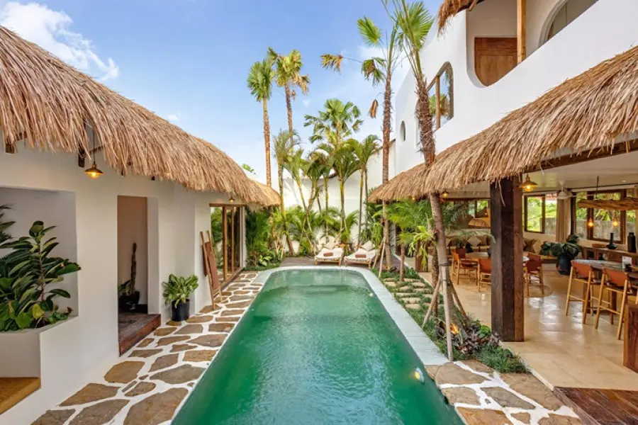 About the Villa Welcome to our stunning combo of two stylish villas about 15m from each other located in the heart of Kerobokan, Bali! It features dazzling white walls and Mediterranean-inspired vibes, making it the perfect blend of relaxation and sophistication. Perfect for large groups, these villas offer a total of 8 beautifully designed bedrooms that can accommodate up to 20px with 4 extra beds added at extra charge. Outdoor Areas The first villa greets guests with a serene 8x3 meter private pool surrounded by lush greenery and a signature palm tree, creating a peaceful tropical retreat. In the second villa, the outdoor spaces are equally captivating, with a bigger stunning swimming pool than the first villa surrounded by a vibrant tropical garden, sun loungers, and a cozy gazebo. Whether you're unwinding with a book or enjoying a floating breakfast, the outdoor areas are designed for ultimate relaxation. Indoor Areas Step inside the first villa to find an open-plan layout with poolside views, a spacious living area with plush sofas, and a fully equipped kitchen. The dining area is perfectly positioned by the pool, offering a beautiful backdrop for every meal. The second villa boasts a large living room with breathtaking rice field views, a comfortable seating area, and a well-equipped modern kitchen. Additional conveniences such as a guest toilet and laundry room ensure a comfortable stay for all. Bedrooms The first villa offers three bedrooms, two upstairs and one on the ground floor. Each with its own ensuite bathroom, providing a private and comfortable sanctuary for guests. In the second villa, there are five bedrooms. Two are located on the ground floor with direct pool access, while the upstairs bedrooms offer stunning rice field views. The master suite features a soaking tub, and extra beds can be arranged for larger groups, ensuring comfort for up to 14 guests. Our Services Both villas are committed to providing exceptional service throughout your stay. In the first villa, guests enjoy daily housekeeping and assistance with transportation or recommendations for local attractions. The second villa also offers daily housekeeping, as well as additional services like in-villa massages, private drivers, scooter rentals, and baby equipment, including cots and pool gates. The location of both villas is ideal for exploring Bali, with the second villa just a short walk from Batu Belig Beach and a 15-minute scooter ride from central Canggu.